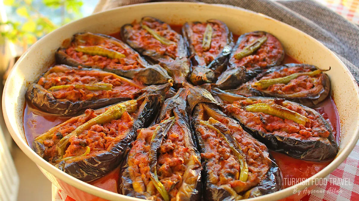 No discussion of Turkish eggplant is complete without mentioning the crown jewels of the cuisine: Karnıyarık and İmam Bayıldı, both of which translate the deep understanding Turks have for this versatile vegetable. Karnıyarık, meaning “split belly,” is a beloved main dish featuring whole eggplants that are fried or baked until tender, then slit open and stuffed with a rich mixture of sautéed ground meat, onions, garlic, tomatoes, and parsley. The dish is then baked in a light tomato sauce until the meat is fully cooked and the eggplant flesh is melt-in-your-mouth soft.